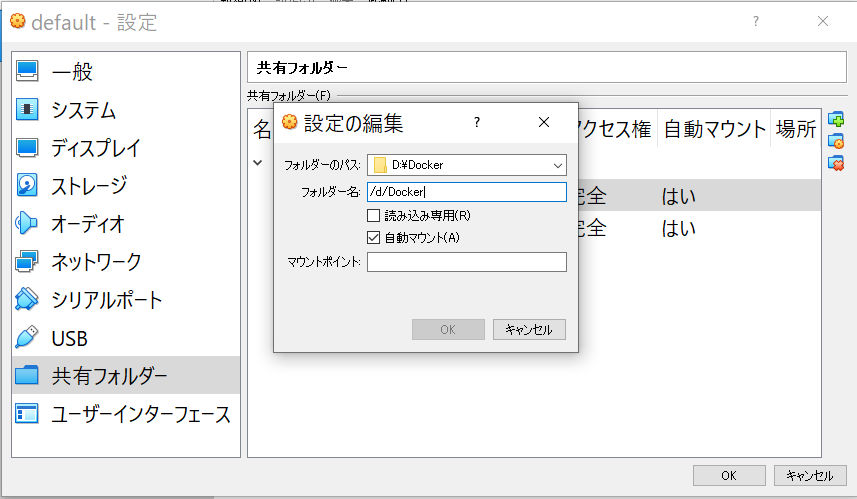 ソフトウェア:docker:docker_toolboxでマウント_共有フォルダ_設定